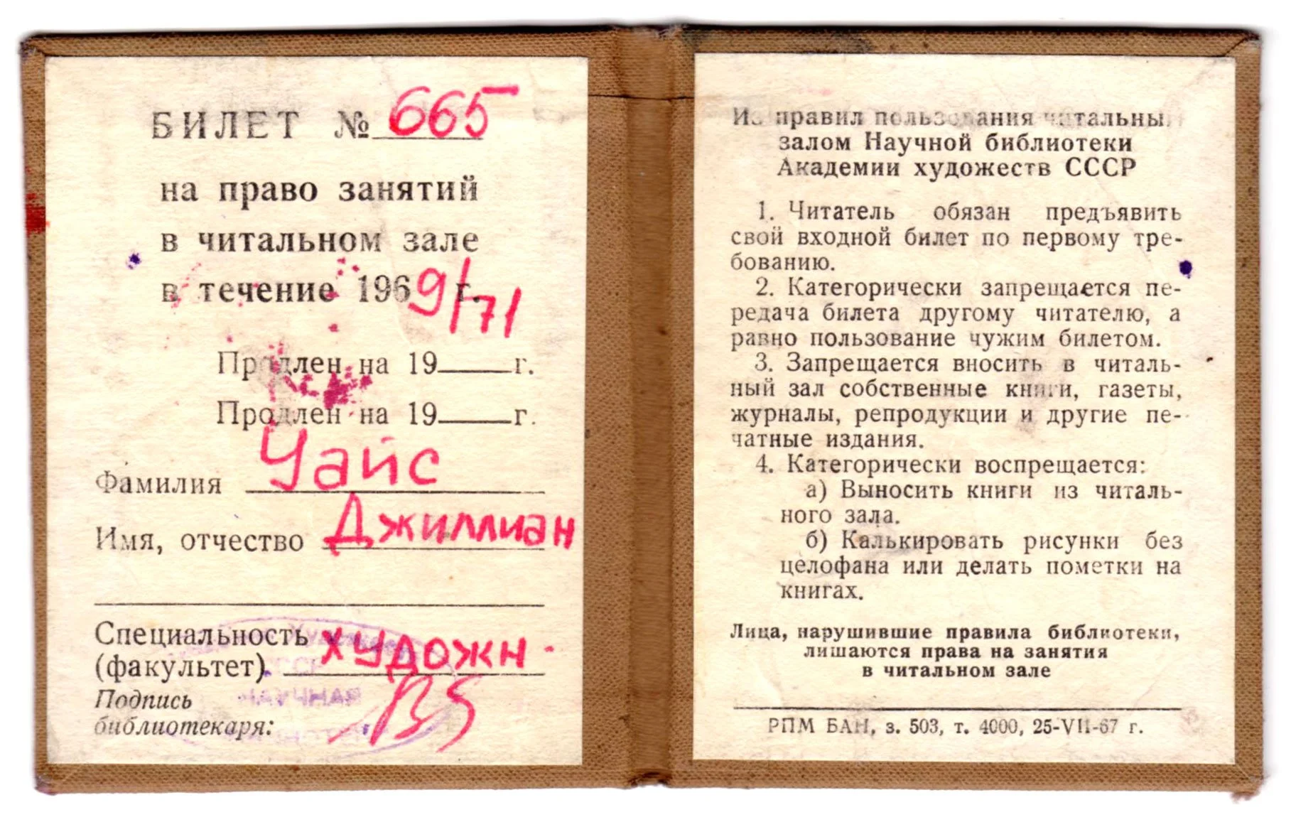 Library pass during studies of the Soviet Modern Movement